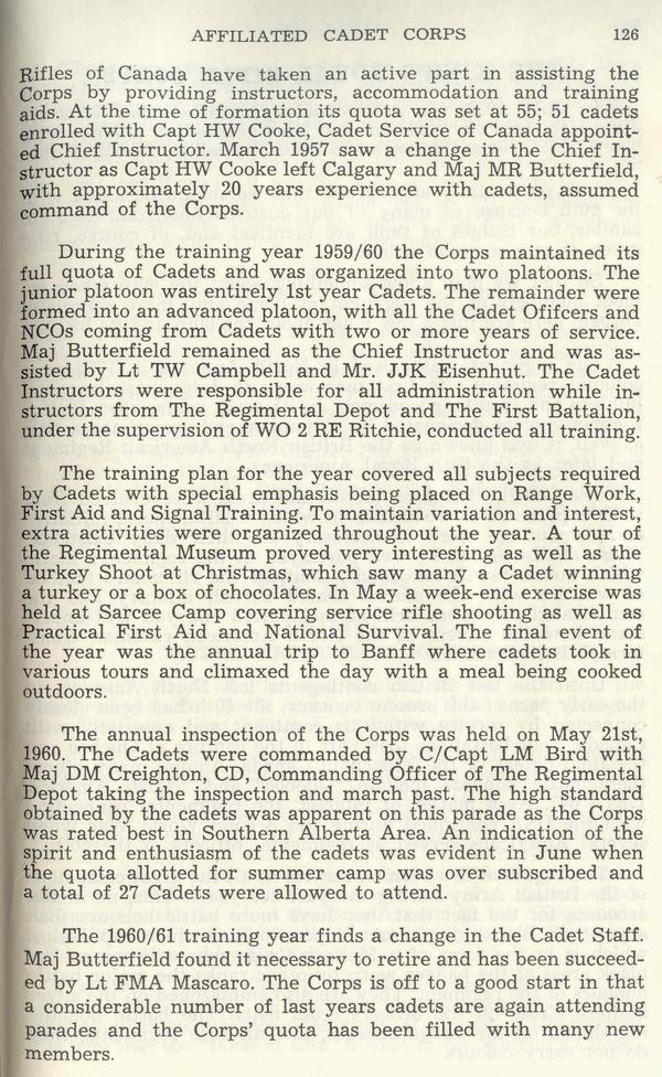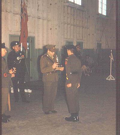 2554 QOR Cadet Corps annual inspection 1960, Capt Ray Butterfield presenting trophy. MWO R.E. Ritchie CD (1st from left) Maj Fred Swan CD (2nd from left) (Capt M. Ray Butterfield )
