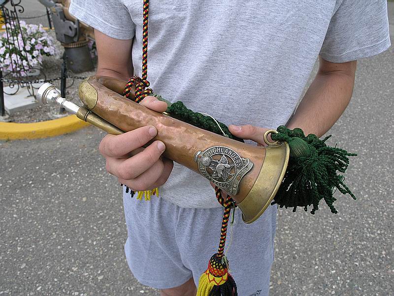 This bugle once belonged to 765 Coppercliff Highlanders, made of copper an brass it dates back to at least WWI and perhaps as far back as the Boer War. Very little history is known about this bugle. The cap badge is the WWII pattern badge, so it could have been attached to the bugle as early as 1944.