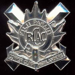 Badge designed by Band Major Sam Laderoute. He was their Pipe band instructor for almost 50 years. Band played on for a couple of years after the Corp was disbanded, hence new badge. Coppercliff Highlanders, 1917-1992.