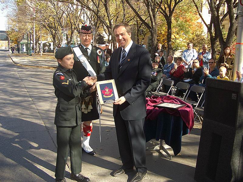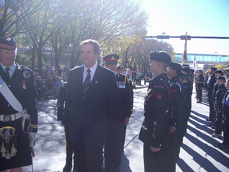 On Saturday October 2, 2004 the army cadet corps of Southern Alberta comprising of 220 cadets and officers massed for the Freedom of the City Parade in downtown Calgary. With a beautiful sunny autumn morning, the cadets corps formed up on Stephen Avenue Mall and marched onto city hall where they were halted by Deputy Chief of Police Rick Hansen. Captain Les Klapatiuk CD (2383 CC) was the parade commander, Capt Brent Wood (2137 CC), RSM was Cadet CWO Pedra Marshall (1292 CC). Mayor Dave Bronconnier read the proclamation and the ceremonial order to “fix bayonets” was given. The RCAC Royal Banner was uncased and paraded in Calgary for the first time ever. The combined corps were inspected by the mayor and deputy police chief after which the parade marched 13 blocks from City Hall to historic Mewata Armoury. Many hundreds of spectators lined the 1.5 km parade route applauding the cadets. A BBQ was catered by 14 Svc Bn and their flying kitchen for the cadets following the parade. The Army Cadet League (Southern Zone, Alberta) spent nearly a year planning the parade. A special thanks to Lt Rob Craddock, Capt Les Klapatiuk and Sgt Denny Russell (Calg Higher) for their assistance in this important event celebrating the 125th Anniversary