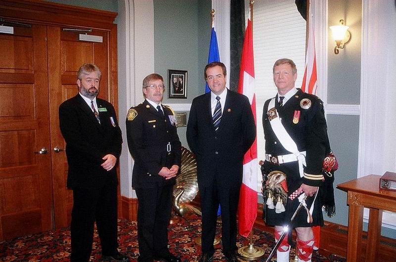 Ed Liukaitis (Chairman Southern Zone Army Cadet League Alberta Branch), Rick Hanson (Deputy Chief Police), Mayor Dave Bronconnier, Capt Les Klaptiuk CD (Parade Commander) in the mayor's office before returning to the parade - (Capt Chris Gerbrandt)