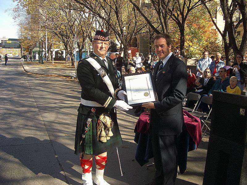 Mayor David Bronconnier presents the Freedom of the City 125th proclamation to Parade Commander Capt Les Klaptiuk. (Celine Arseneault)