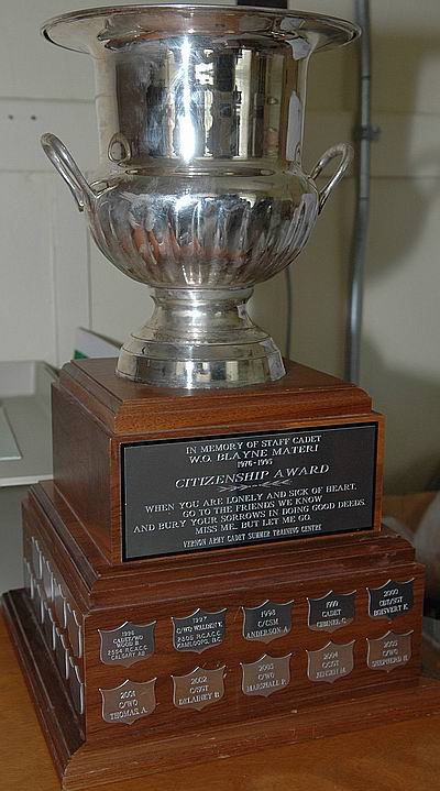 This award is presented in memory of Cadet MWO Blayne Materi. The award is presented to the cadet who has participated in or supported activities with the local community, who has taken a personal interest in the well being and morale of his cadets, who respects and used authority properly and maintains outstanding personal conduct.