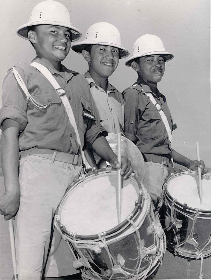 Corps of Drums, 1959. Drum Major Barry Phillips from 170 C Scot R University School RC(Army)CC. Robert Russell is 4th row marker. Note - H10 in the background (Maj Cam Leblond, 1705 BCD RC(Army)CC Collection)