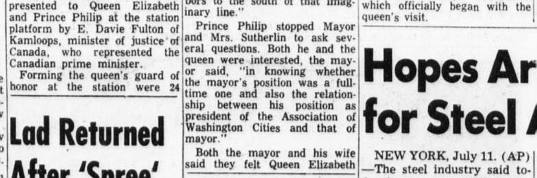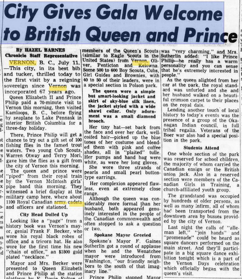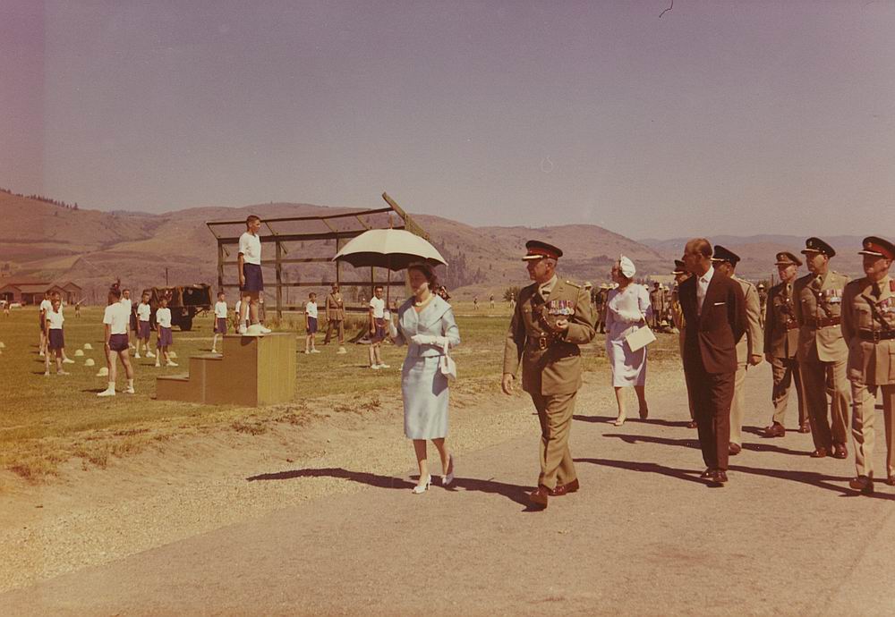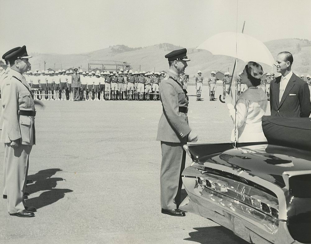 Her Majesty, Queen Elizabeth II and His Highness Prince Philip the Colonel in Chief of the RCAC, visit Vernon, (Lilley collection, Greater Vernon Museum)
