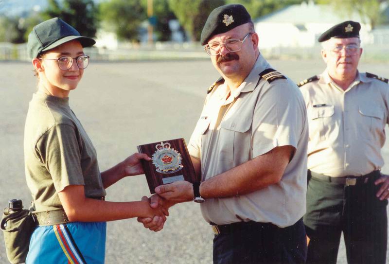 Cdt Brandy Blum awarded best cadet Basic Cadet Course 2nd intake by Maj Russ Lacey, the late Capt Ray MacIssac in the background. Cdt Blum would go on to be awarded best 6 week cadet in 1993, bets CLI cadet in 1994, and eventually the Sword of Honour in 1996. She is today a CIC officer. (Lyle Johnson)